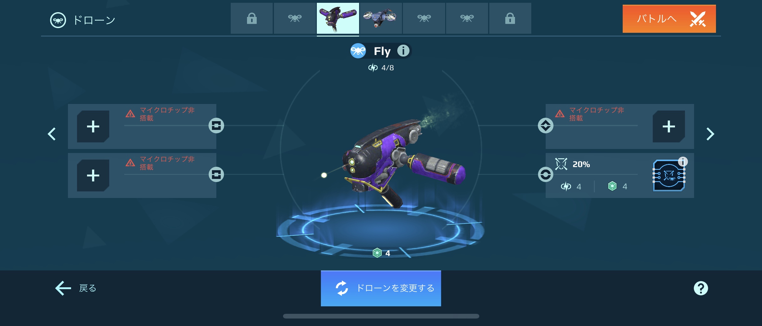ドローンは現在恒常的に買えるのは6種類存在している。各ドローンに決められたバッテリーがある。そのバッテリーの容量によって積めるチップが変わってくる。