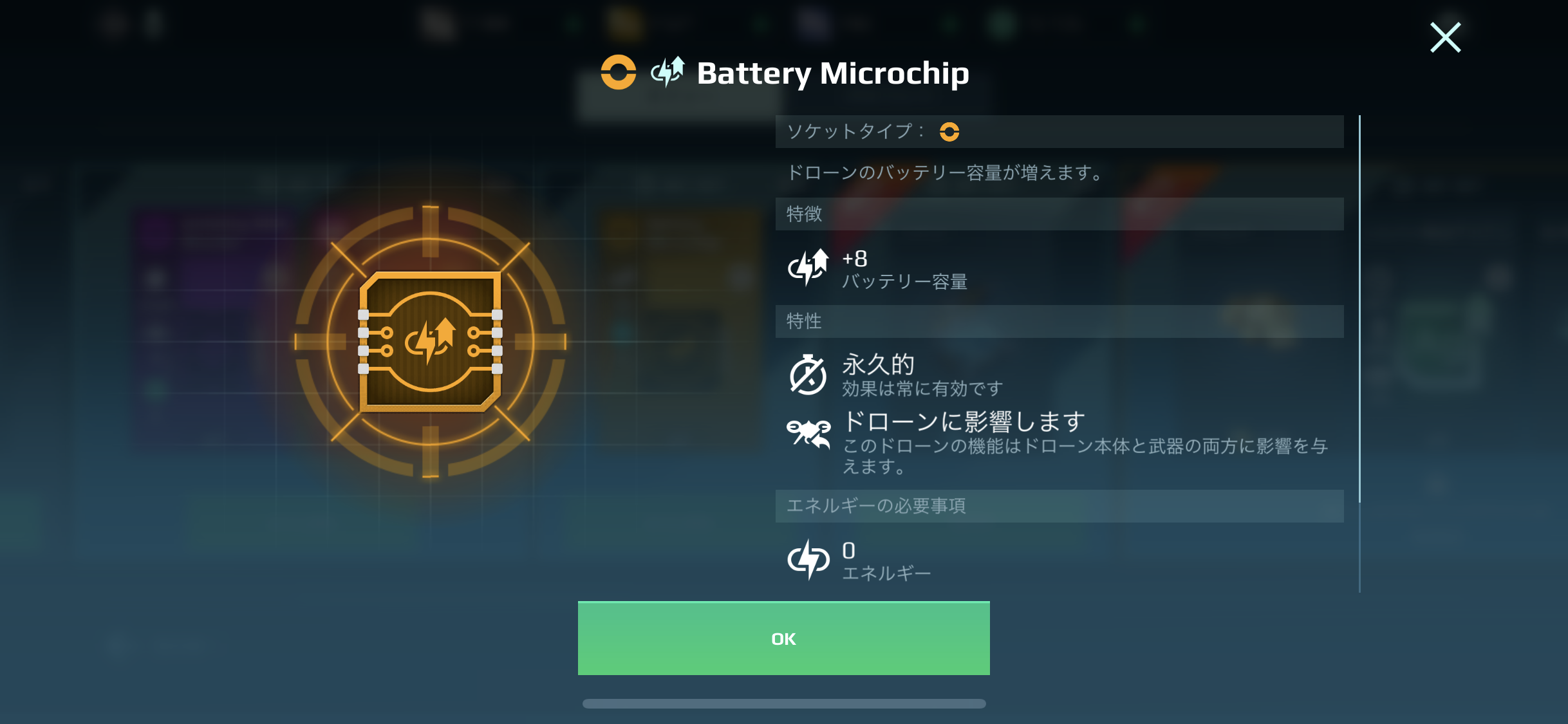 次に費用について説明すると、チップにはそれぞれ費用(パワーセル又はAu)がかかる。さっきの例にある通り、写真にあるチップを積んで機体に付けた場合、下に書いてある8パワーセル又は6Auが出した時点で支払われる。例えばパワーセル4でバッテリー容量4のチップを上の写真のドローンに載せた場合、機体を選んで、ドローンを選んで出撃した瞬間に8パワーセル自動で支払われる(アクティブモジュールを想像して頂ければいいだろう)。選んで出撃した瞬間に支払われるわけだが、一試合でその機体が壊れない限りは何度でもチップのスキルは条件を満たせば使える。つまり、うまく機体を扱えば前払いの元を取れるといったら変だろうがコストに見合った以上の成果が期待できる。