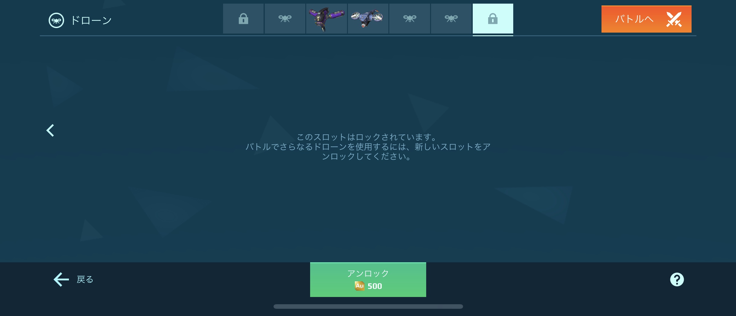 下記の写真にある通り、ドローンは最大で7枠あり標準時で5枠は開放されている。6枠目は500Au、7枠目は検証を願うが、おそらく500Au。