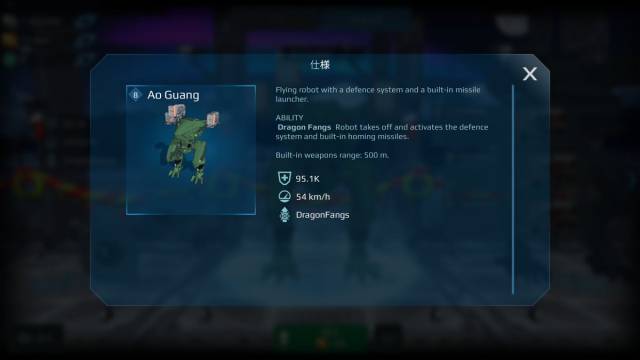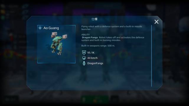 ![]() | Ao Guang(敖廣:ごうこう) 中機体 武器:中×3 アビリティスロット:パッシブ3、アクティブ1 アビリティ:DragonFangs ダメージカット+滞空移動+ターゲットしている敵が500m以内かつ正面に捉えている時、自動でミサイル攻撃。 ミサイルの軌道は直線的であるが、多少の建物は超えてくる。発射数も多い。 アビリティ使用時は機体側面と上部のウィングを展開、脊椎状の尾部のようなものをまっすぐ伸ばす。本体と足の裏から噴射炎が出るようになった。 |