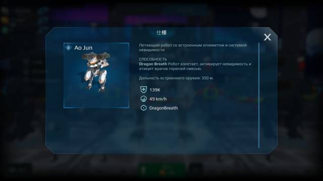 ![]() | Ao Jun(敖閏:ごうじゅん) 中機体 武器:重×2 アビリティスロット:パッシブ3、アクティブ1 アビリティ:DragonBreath ステルス+滞空移動+ターゲットしている敵が350m以内かつ正面に捉えている時、機体正面を上下に開いて自動で火炎放射攻撃。 アビリティ使用時は機体側面のウィングを展開、更にウィングに付いたスラスターハッチも展開し、脚部を折りたたむ。足の裏からは噴射炎が見える。 |