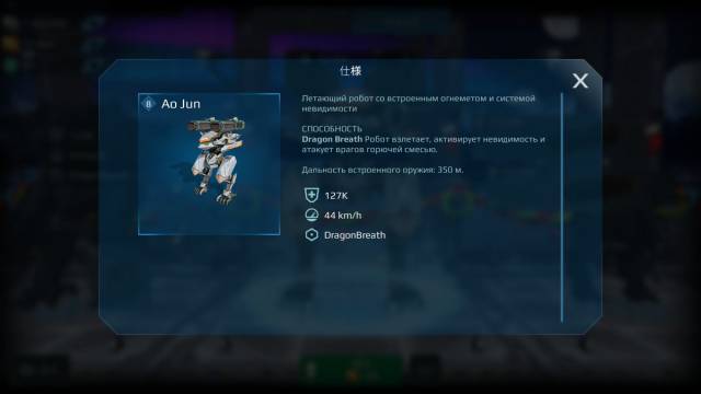 ![]() | Ao Jun(敖閏:ごうじゅん) 中機体 武器:重×2 アビリティスロット:パッシブ3、アクティブ1 アビリティ:DragonBreath ステルス+滞空移動+ターゲットしている敵が350m以内かつ正面に捉えている時、機体正面を上下に開いて自動で火炎放射攻撃。 アビリティ使用時は機体側面のウィングを展開、更にウィングに付いたスラスターハッチも展開し、脚部を折りたたむ。本体と足の裏からは噴射炎が見える。 |