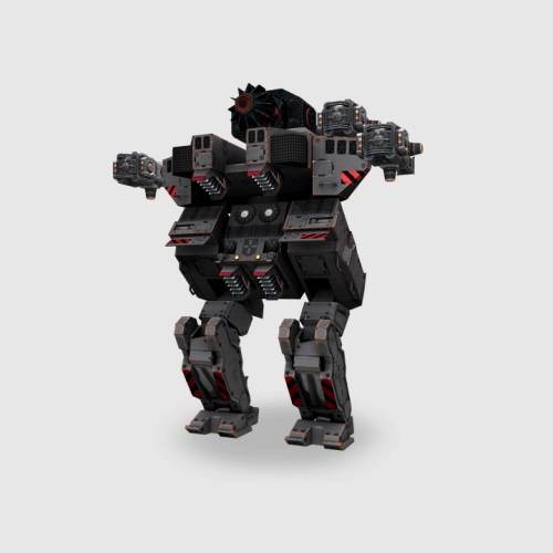 ・凹凸が少ない平面的な装甲が特徴で、赤いセンサー?が機体頭部正面にある。脚部には白、黄色のライトのようなディテールもある。機体右肩部、軽量武器スロットのすぐ近くにはカメラ?のような部分があり、反対側の左肩後方にはスモークディスチャージャーのように小さめの円筒パーツが並んでいる。後方から見ると頭部・腰部に冷却用のダクト?のようなものが4つあり、頭部両端、脚部裏には注意表示かトラ模様が描かれている。脚部も四角く重厚な印象を受けるが、接地面は意外にも重機体の中では小さめである。